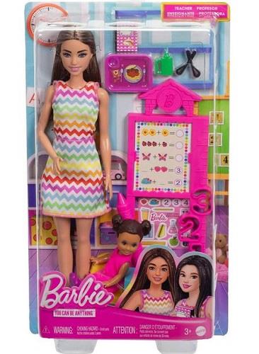 Préparez-vous à apprendre avec la poupée Barbie enseignante ! Barbie enseigne à sa petite élève vêtue de sa robe et de ses chaussures imprimées amovibles. Le coffret comprend des autocollants à coller au tableau pour donner vie à l'histoire ! Avec d'autres accessoires pour la classe, comme des ciseaux de sécurité, un sac à dos et une chaise pour la petite élève, laissez libre cours à votre imagination pour créer un monde plein de possibilités de narration et de carrières avec cette poupée puissante, prête à inspirer les enfants à devenir tout ce qu'ils veulent ! La poupée ne tient pas debout toute seule.