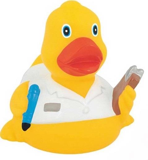 Floatable rubber clinical duck that is holding a clipboard and a pen