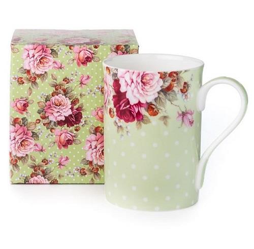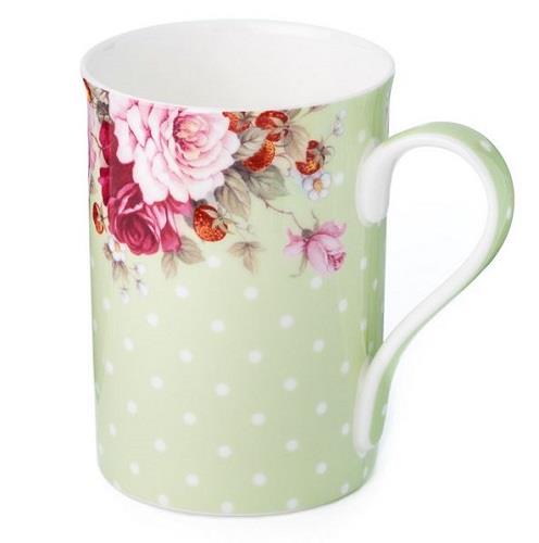 The "Dots & Roses Green" fine bone china mug is the perfect addition to your morning routine. This mug is designed with a beautiful green polka dot pattern, paired with elegant and delicate pink and red roses, making it a perfect blend of classic and modern design. The fine bone china material is not only elegant and durable, but also lightweight and easy to clean, making it suitable for everyday use. Whether you're sipping your morning coffee or tea, this mug will add a touch of sophistication to your breakfast table. Perfect for gifting to a loved one or for a special occasion, this mug comes in an attractive gift box, ready to be given as a gift without any hassle. Don't wait any longer, add the "Dots & Roses Green" fine bone china mug to your collection today!