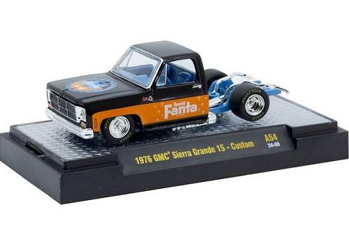 Citrus Style: '76 Sierra Grande Rolls Out in Fanta Flair. Bursting with retro flavor, this 1:64 scale 1976 GMC Sierra Grande 15 Custom by M2 Machines sports vibrant Fanta-branded Coca-Cola licensed graphics over a sharply detailed diecast body and chassis. With full interior detailing, smooth-rolling rubber tires, and authentic exterior trim, it captures the bold spirit of the '70s in miniature. Delivered on a full-color Coca-Cola blister card, it's a refreshing twist on classic truck collecting.