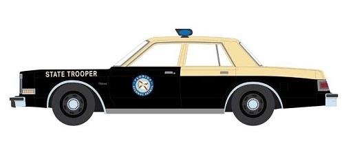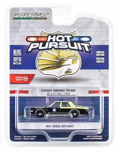 Introducing the 1/64 scale 1983 Dodge Diplomat, featuring the iconic Florida Highway Patrol design, part of the thrilling Hot Pursuit Series 45. Crafted by Greenlight Collectibles, this diecast metal replica boasts a sturdy chassis, rubber tires, and select plastic components. Perfect for display, not for play, suitable for ages 14 and up. The vehicle measures approximately 3.25 inches in length, 1.25 inches in height, and 1.5 inches in width, making it an impressive addition to any collection.