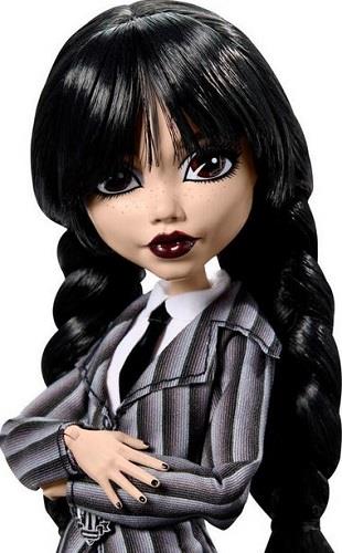 The minds behind Monster High and Wednesday have collaborated to create a chillingly beautiful line of dolls inspired by the hit television series. Dressed to distress in all black from head to toe, this Wednesday Addams collectible doll drips dark charm in her Nevermore Academy uniform. With Thing crouched at her shoulder and killer shoes at her feet, she's more than ready to uncover any morbid mysteries that lie in wait. Doll cannot stand alone. Doll stand included.