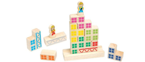The sky is the limit! Build your way up with the wooden blocks, but make sure your builders always keep their feet on the building so they can supervise the work. You have finished the challenge when the building is completed and your little builder stands on top of it. Challenging for the whole family!
