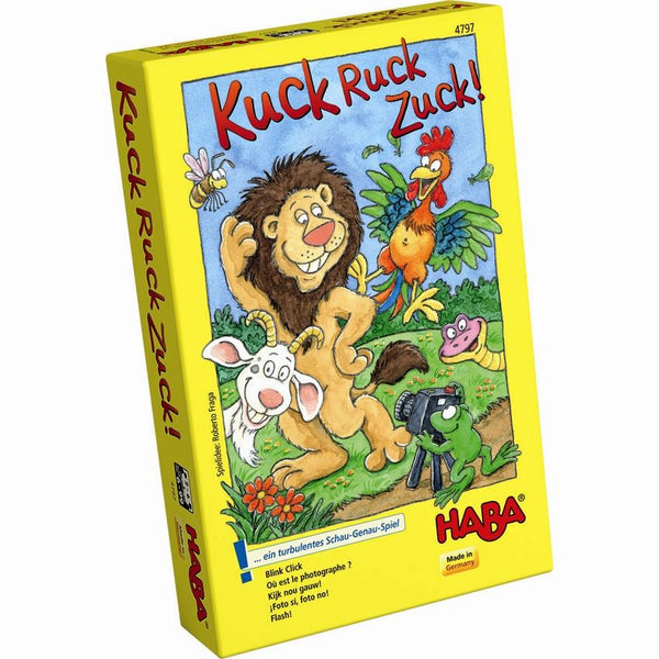 You can spot the fun! Excitement abounds for those with superior spotting skills in the Blink Click game from HABA! The zoo animals are tired of being photographed all the time, so in a flash they pinch the camera of a zoo visitor and take snapshots of each other! The zookeepers, however, only find funny snapshots of animals. There is no trace of the camera! Who has the camera at the moment? In order to find out, the zookeepers have to reconstruct who has taken the pictures by examining the animals featured. Only the one who is good at combining and has an alert eye can be quick here and win the game! A far-sighted look-closely game perfect for ages 6 and up!