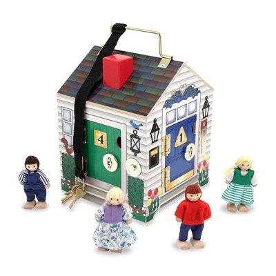 Your child can ring the bell on the Melissa & Doug Doorbell House to hear one of four fun sounds, then unlock each of the locks with the four matching keys. One of the posable play people can answer the door, then invite his or her guests inside. The keys are attached to the house to prevent them from getting lost, and a carrying handle allows simple portability.
