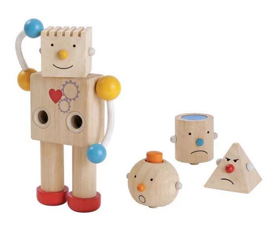This charming robot features four interchangeable heads, which teach emotions and offer different tactile & auditory experiences. Legs are movable for standing or sitting. Helps children develop emotionally and cognitively by inviting them to express their emotions and feelings through play. Includes 4 interchangeable heads with various expressions. Legs can be manipulated to make the robot stand or sit. Sustainably made in Thailand using chemical-free rubberwood, formaldehyde-free glue, organic pigments and water-based dyes.