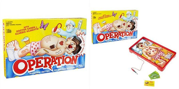 Dans le jeu Opération, vous devenez le médecin et améliorez Cavity Sam ou obtenez le buzzer! Le guérir de tous ses maux farfelus comme le mal de tête de casque et le pouce de gamer en choisissant des morceaux de maladie drôles sur le plateau de jeu avec une paire de pinces. Mais attention! Si vous touchez les côtés des ouvertures, vous obtiendrez le buzzer et illuminerez le nez de Cavity Sam! Le joueur qui enlève le plus de maux gagne!