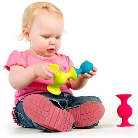 What happens when babies and toddlers encounter playful colors, fun sounds, fresh tactile experiences and super-suction? Meet pipSquigz, a set of three Fun Little Suckers for ages 6 months and up. Adored by baby and parents alike, pipSquigz are perfect for the stroller, highchair, bathtub, and anywhere-travel. Simply push pipSquigz down onto any smooth surface and watch baby interact with this high-quality silicone suction toy. With super-suction, each shape can be tugged, pushed, shaken and pulled. Or, push and stick the shapes together for new play experiences. Babies delight in the versatile movement, sound and texture. Pediatricians note sensory integration as a crucial developmental milestone for infants. pipSquigz are right on target. The wavy ridges, bumps, and debossed, smiling face stimulate the fingers. The "just right" rattles and the POP of the suction cups thrill the ears. The brilliant colors mesmerize the eyes while the soft. PipSquigz is an all-in-one sensory learning experience! Not to mention, they're also wonderfully portable and completely dishwasher safe. Discover peace of mind for parents and teething babies with pipSquigz.
