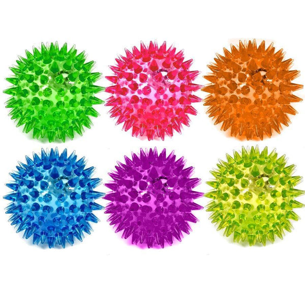 Our Spiky Squeaky Light Up bounce Balls are a wonderful tactile ball with a soft spiky-textured surface to touch, watch and experience. These Spiky sensory balls are hard wearing plastic and TPR is high Eco-friend, yet pliable and soft to touch. Simply bounce the ball on a firm surface to activate the internal flashing lights. The light stops automatically. Tactile, and easy to throw, catch and hold. Use our Spiky Sensory Ball for flexible massage & stimulation, hand & finger exercise, and throwing & catching skills. Excellent sensory resource for children and adults with special needs, autism and sensory impairments. Great therapy exerciser and aid.