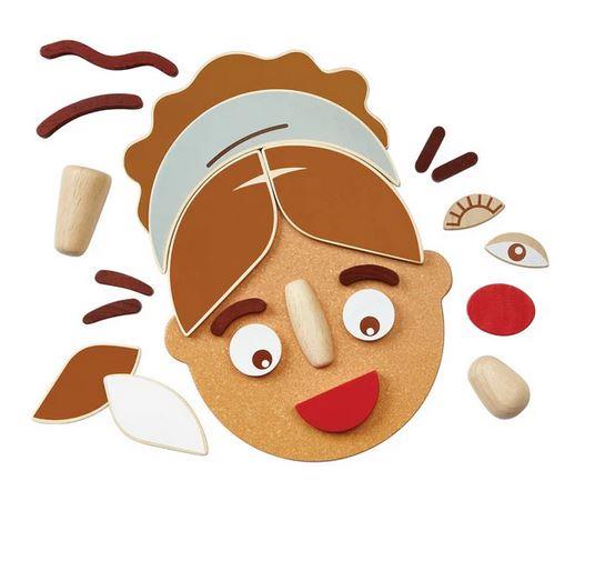 Recollect a familiar face or express your emotions with PlanToys Build A Face! Revisit memories and feelings of joy when the face is complete. This set contains a variety of facial features that can assemble a range of faces and emotions to either best suit your mood, or trigger memories and creative thinking. This is a soothing activity that can be played solo or with a group to spark conversation and bring a smile to your face! Build A Face includes 1 two-sided face, 21 facial components, and a cloth bag for storage. Can be played by ones self or with a group of friends and family. A teaching tool to express feelings and emotions. Create the faces of friends and family members or completely original faces using the many facial feature components. Sustainably made in Thailand using chemical-free rubberwood, formaldehyde-free glue, organic pigments and water-based dyes.