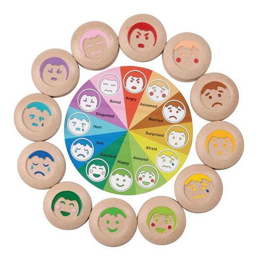 The set consists of 24 wooden tiles with 12 different emotions. Children can learn how to match two identical emotions with this fun memory game! Skills include learning about the relationship of colors and emotions. Emotion Color Wheel can help visually group feeling and practice emotion vocabulary. Help your child understand the importance of expressing feelings and emotions in a healthy way. Includes 24 wooden tiles with 12 different emotions for matching and categorizing. Encourages development of emotional intelligence and supports communication skills through play. Sustainably made in Thailand using chemical-free rubberwood, formaldehyde-free glue, organic pigments and water-based dyes.