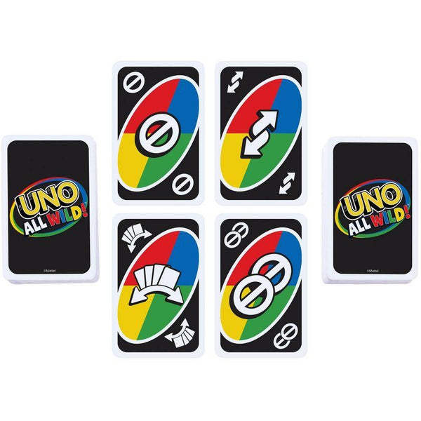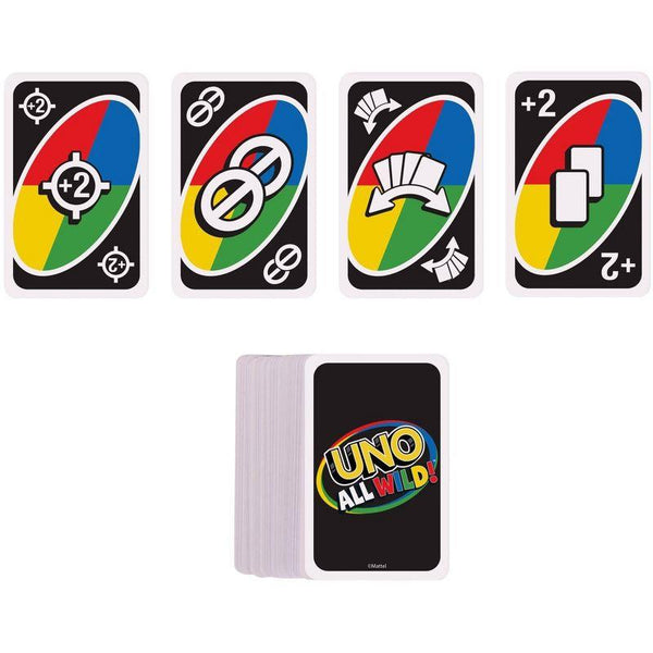 In UNO All Wild card game, every single card is wild for a fast-paced, even more unpredictable version of this family favorite! There's no matching of number or color like regular UNO, but it's not as easy as it sounds. Special Action Cards really change the game! There's a Wild Skip Two card where players skip two other players instead of the traditional one, a Wild Forced Swap card where players change entire hands and more! This edition is as addictive as it is exhilarating and makes a great gift. Colors and decorations may vary.