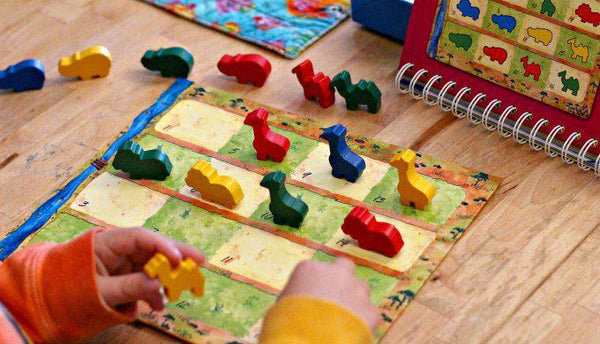 • 16 wooden animals in yellow, blue, green, and red