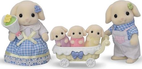 The Flora Rabbit Family have adorable droopy ears and love flowers. This set contains the father, mother, three cradled babies and a variety of accessories. The flower and clover on the figures' ears can be swapped with the flowers in the bouquet. You can put the three babies in the baby carriage. The flower on the mother's ear and the clover on the father's ear can be swapped between the figures. The Flora Rabbit family members are wearing matching checkered outfits in a cool blue colour. Nolan the Flora Rabbit father is a gentle type who'll make herbal tea for anyone. He talks to his plants so much that the children think the flowers can really understand him! Aria the Flora Rabbit mother is a wonderful singer and piano player. She's a teacher at the nursery school—the babies love how kind she is and how much fun they have with her. She can't draw well at all, though! The triplets' names are Rosemary, Thyme and Sage. Combine with the Blossom Gardening Set -Flora Rabbit Sister & Brother-, Flora Rabbit Twins and Sunny Castle Nursery (sold separately) to collect the whole family for even more fun. The flower and clover on the figures' ears can be swapped with those in the Blossom Gardening Set -Flora Rabbit Sister & Brother- and Sunny Castle Nursery (sold separately).