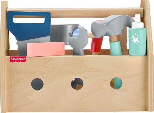 Preschool kids can fix up and build all kinds of pretend projects with this Wooden Tool Box Set from Fisher-Price. This 9-piece playset has everything your little DIY-er needs, including a toy drill, hammer, screwdriver, wrench, saw, pliers, square ruler, bottle of glue and a toolbox to store all their handy equipment! Made with wood from Forest Stewardship Council-certified sources (FSC-N004566) and decorated with non-toxic, water-based paints, this wooden toy tool set encourages imaginative role-play for aspiring builders.