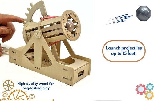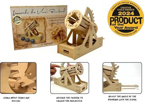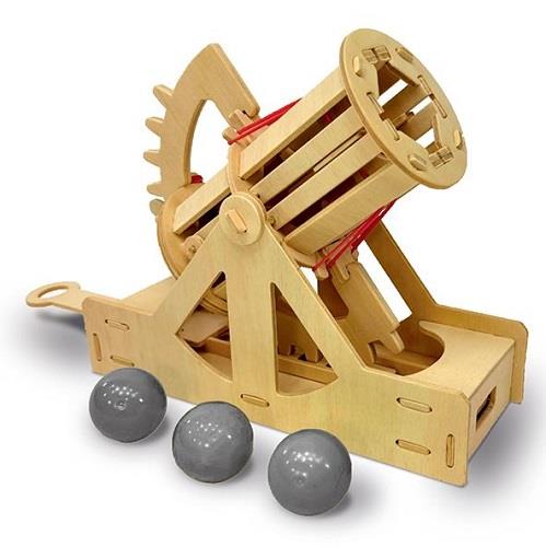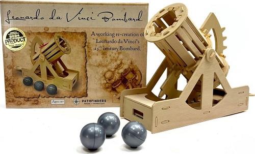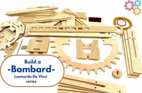 The Leonardo da Vinci Bombard is a working re-creation of his 15th Century design. As well as being an artist, Leonardo was a military engineer who drew many designs of weapons for the Dukes of his time. This bombard re-creates one of Leonardo's iconic images of a cannon and exploding cannonballs. Launch projectiles and re-live those whimsical Renaissance days! The Bombard is a type of cannon that was used during the Middle Ages and early modern period. Leonardo da Vinci's Bombard was designed with an eploding hollow projectile that contained many more small projectiles that would rain down on the enemy. Powered by elastics, this working model has hollow projectiles, great for scientific testing of how weight, and trajectory angles affects distance when launched. Easy to make in about an hour. Natural untread wood from sustainable forests. All pieces pre-cut and ready to go. Launches cool hollow balls over 2 metres. A fun STEM kit that also includes history!