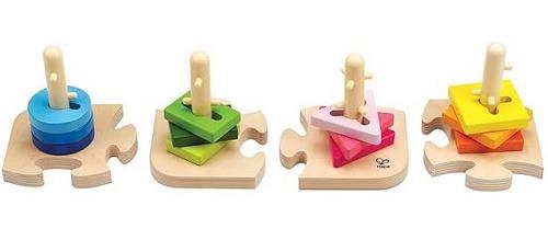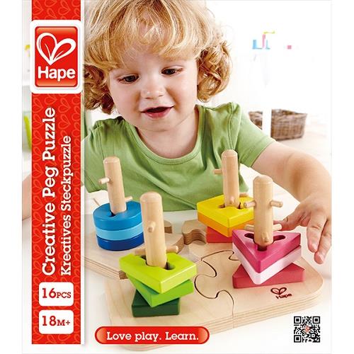 Practice basic shape and color recognition with this best-selling, innovatively designed toy from Hape! The Creative Peg Puzzle has grooved shapes and pegged posts, adding an extra dimension of challenge to this colorful puzzle, and providing children hours of entertainment. Join the four puzzle bases together and then twist the variously shaped and colored puzzle pieces onto the posts. This puzzle fits and stacks together endlessly. Stack together these expertly crafted, colorful pieces to create the ultimate puzzle. Encourages the development of coordination, fine motor skills, and problem-solving abilities. Durable child-safe paint finish and solid wood construction make this a toy your child will love for years to come.