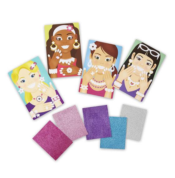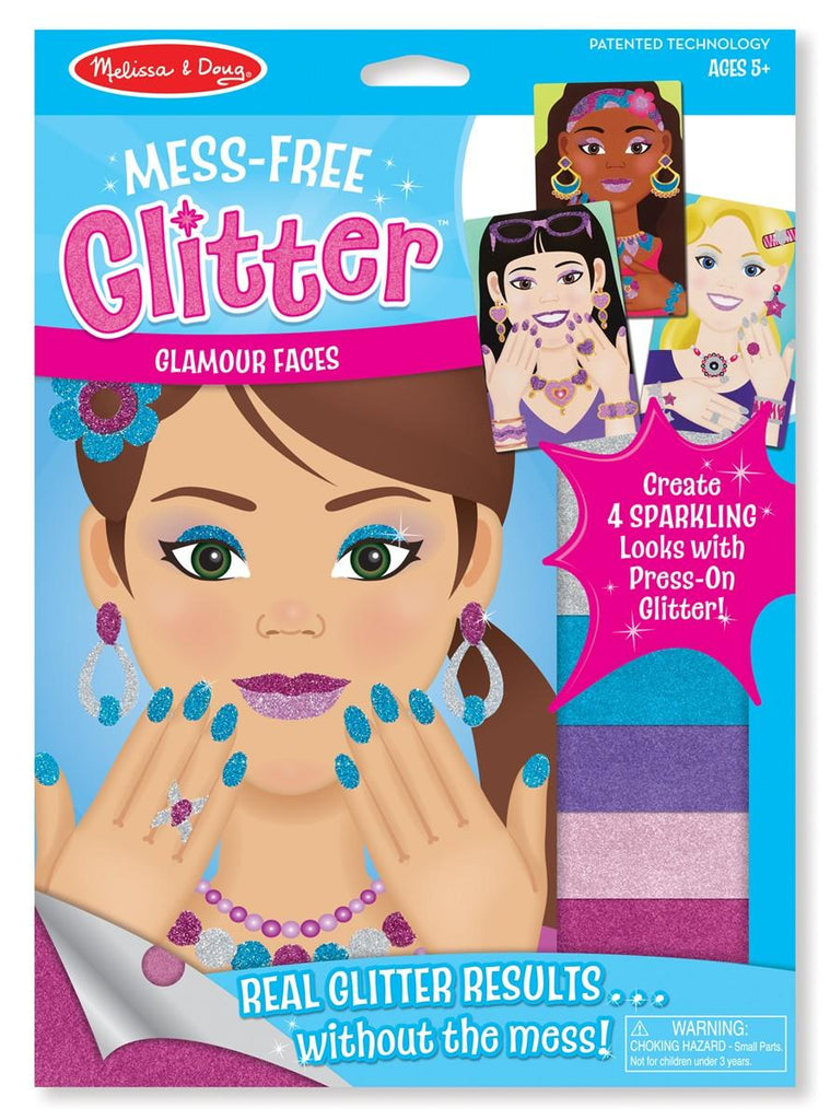Make 4 gorgeous peel-and-sparkle glamour faces! Our patented technology lets kids get the look and feel of real glitter without the mess. One simple process creates amazing results: Just peel away a section of white paper from the glamour faces to reveal the sticky surface, then press on one of the 5 glitter sheets for instant sparkling art.