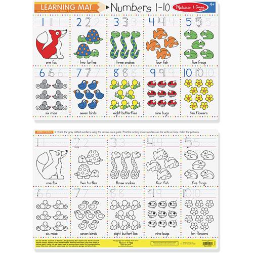 Melissa & Doug Learning Mats offrent des compétences en double face dans un format amusant. Ces tapis sont conçus pour aider les enfants à maîtriser des compétences importantes. Les tapis offrent des techniques guidées visuellement avec des graphiques colorés. Write & Wipe permet d'utiliser encore des tapis d'apprentissage. Les numéros 1-10 Mat ont les numéros 1-10 et une illustration de couleur pour accompagner chaque numéro. Les illustrations sont étiquetées. Le verso est une copie en noir et blanc de l'avant complète avec un espace pour les enfants de pratiquer les numéros d'écriture. Chaque numéro a des guides visuels pour aider à la formation appropriée des nombres. Les illustrations peuvent également être colorées. Age recommandé: 4+