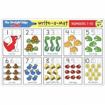 Melissa & Doug Learning Mats provide double sided skills practice in a fun format. These placemats are designed to help children master important skills. Mats offer visually guided techniques with brightly coloured graphics. Write & Wipe allows for Learning Mats to be used again and again. The Numbers 1-10 Mat has numerals 1-10 and a colour illustration to go along with each number. Illustrations are labeled. The reverse side is a black and white copy of the front complete with space for kids to practice writing numbers. Each number has visual guides to help with proper number formation. Illustrations can be coloured in too. Recommended age: 4+