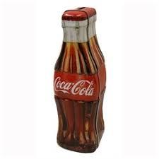 Our Coke bottle tin bank resembles the bottle originally used in 1886. It has a red top and red label with the words "Coca Cola" in white.