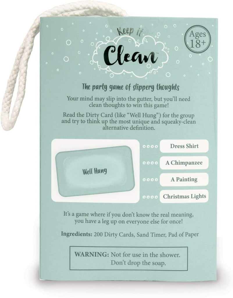Pouvez-vous éviter les pensées sales pendant 60 secondes ? C'est plus difficile que vous ne le pensez lorsque vous devez créer des significations alternatives pour des phrases sales comme "Well Hung" et "Red Hot". Vous obtenez des points pour l'originalité ; donc les joueurs qui ne connaissent pas le vrai sens ont une longueur d'avance sur la concurrence. Keep It Clean est une "fin heureuse" parfaite pour une soirée de fin de soirée, fait une pause d'étude "rapide" à l'université et vous permet de vous battre pour voir qui est "toujours au top!"