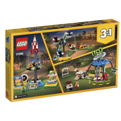 Enjoy 3 building opportunities with this LEGO® Creator 3in1 playset. Build the Carousel and then rebuild it for more fairground fun aboard the Free Fall Ride or wonderful Ferris Wheel. The Fairground Carousel LEGO® set features a space-themed merry-go-round with UFO signage and 4 suspended carriages: a rocket, spa = ce shuttle, alien craft and spotted cow. This construction toy also includes a brick-built ticket stall, park bench and an ice cream cart with buildable ice creams. Turn the red handle and see the carriages rise into the air as the Carousel spins! Includes 3 minifigures: 1 boy and 2 girls, all ready for the fun of the fair. Check out the cool UFO sign complete with flying saucer and alien pilot. Fairground Carousel measures over 7" high, 11" wide and 7" deep. Free Fall Ride measures over 10" high, 4" wide and 3" deep. Ferris Wheel measures over 6" high, 5" wide and 4" deep.
