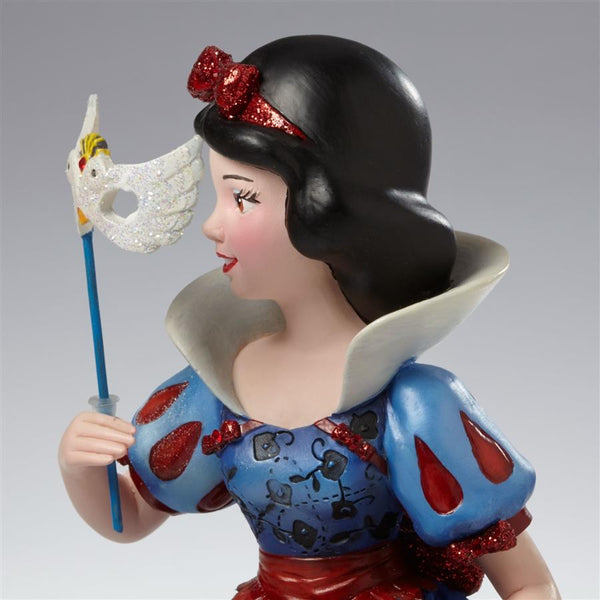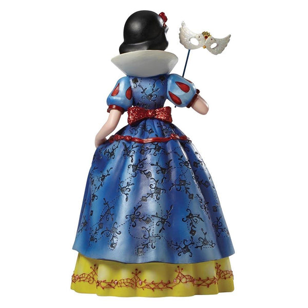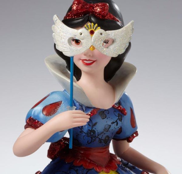 Disney Couture de Force Collection imagines a royal masquerade ball where heroes and villains mingle and pose. Snow White hides behind her white dove mask, reflecting the innocence and beauty that is underneath. Embellished with faceted gems, opalescent paint accents, and glitter. Part of the Disney Showcase Couture de Force Collection.