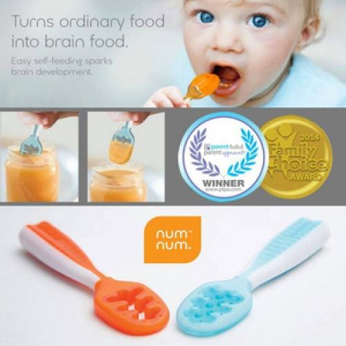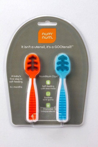 Pre-Spoon GOOtensils. The revolutionary new first step to self-feeding, the NumNum GOOtensil is sold in a dual-stage two-pack. Its innovative desi gn makes it easier to use than a spoon because there's no wrong way to hold it. The blue GOOtensil, which doubles as a feeding teether, is for kids using a utensil for the first time so it grabs just enough food to give baby a taste of self-feeding independence. The orange GOOtensil is for thicker blends and kids who have mastered the food-to-mouth motion. Before long, your baby will begin making a scooping motion, an indication he or she is ready to graduate to the spoon. NumNum, indeed! The NumNum GOOtensil includes two pre-spoons – Stage One for thinner purees, and Stage 2 for thicker purees. Dishwasher safe. The GOOtensil grabs just enough food for baby, while leaving very little mess. Reduces frustration and builds independence. Over time your baby will begin scooping the food, an indication he or she is ready for the spoon. Safe Materials: NumNum uses FDA-grade TPE and foodgrade polypropylene, which are both hypoallergenic and free of PVC, BPA and phthalates