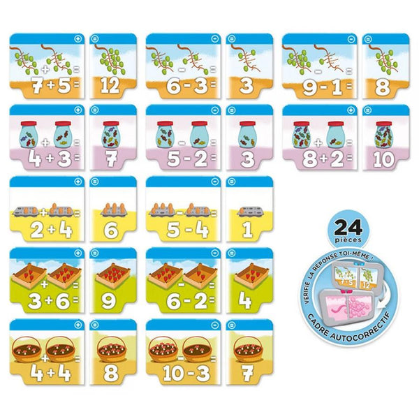 Drag the operation and result into the autocorrelation frame. Return the frame to verify that you are not mistaken. If the image on the back of the frame is whole, it's the right answer! A fun way to discover additions and subtractions. Contains 24 cards to train, 12 pairs and a self-corrective setting.