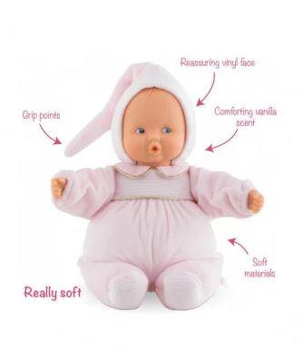 The Babipouce Sweet Dreams by Corolle is a very soft baby doll. Babies love to cuddle and chew on this lovely, durable plush doll. The charming vinyl face comforts baby and is delicately scented with Corolle's signature vanilla scent. The sewn-in label allows for baby's first name to be written down or a number in case Babipouce is lost. Machine washable on a delicate cycle, Babipouce will be baby's favorite toy for a very long time. Comfort baby in a multitude of ways by cuddling or teething; Babipouce Sweet Dreams is durable enough. Every year since 1979, the good fairies at Corolle have called on a wealth of imagination to create dolls, clothing and accessories that fit each child’s age and stage. This play helps them learn about the world around them, imitate what they see, explore their dreams, and let their imaginations run free.