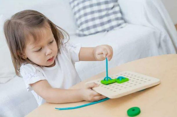 Create your masterpiece from this Lacing Board! This toy helps kids develop fine motor skills and hand-eye coordination, as well as reinforce their creativity. Set Includes: 1 lacing board, 2 laces, 4 different shapes and colors. Develop fine motor skills by creating your own masterpiece on the board. Includes 1 lacing board, 2 laces, 4 different shapes and colors. Incorporate the lacing board into educational play environments or the classroom for dynamic learning opportunity. Sustainably made in Thailand using chemical-free rubberwood, formaldehyde-free glue, organic pigments and water-based dyes.