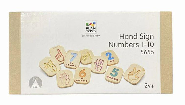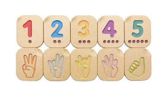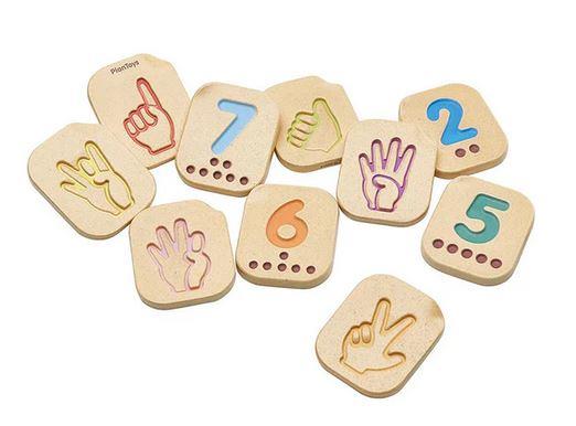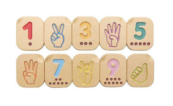 Add variety to your knowledge of numbers with this sign language number set! The 10-piece set features impressed numbers, counting dots, and American Sign Language illustrations that help children learn numbers in various ways. Practice basic sign language skills by learning the numbers 1-10. Trace each number tile with your finger to improve fine motor skills and hand-eye coordination. Incorporate the wooden tiles into learning environments for additional educational play opportunities. Sustainably made in Thailand using chemical-free rubberwood, formaldehyde-free glue, organic pigments and water-based dyes.