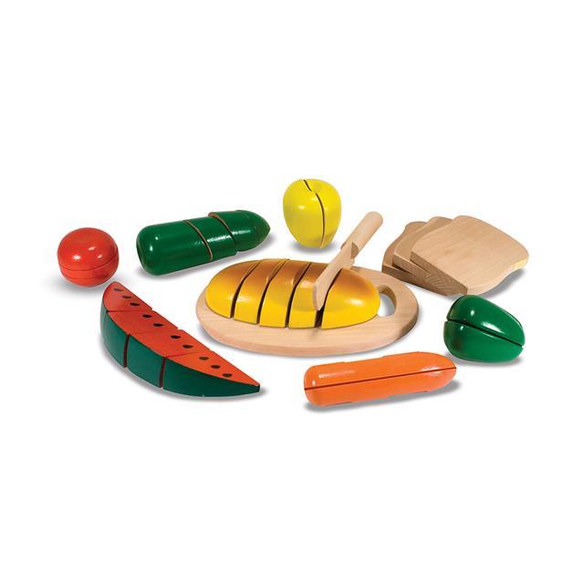 This wooden play food set is perfect for young chefs looking to explore a little mealtime fun - without the mess! It includes eight pieces of wooden food that can be sliced into 25 sections, a cutting board, and a wooden knife. Cutting the food makes a satisfying "crunch" and provides a playful introduction to concepts of "whole," "part," and fractions.