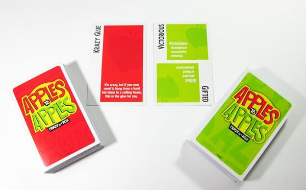 Le jeu de fête Apples to Apples se compose de deux ponts de cartes: Things et Descriptions. Chaque tour, le joueur actif dessine une carte de description (qui comporte un adjectif comme "Poilue" ou "Smarmie") du pont, puis les autres joueurs choisissent secrètement la carte de jeu en main qui correspond le mieux à cette description et la joue face- Sur la table. Le joueur actif révèle alors ces cartes et choisit la carte Thing qui, à son avis, correspond le mieux à la carte Description, qu'il attribue à celui qui a joué cette carte. Ce joueur devient le nouveau joueur actif pour le prochain tour.