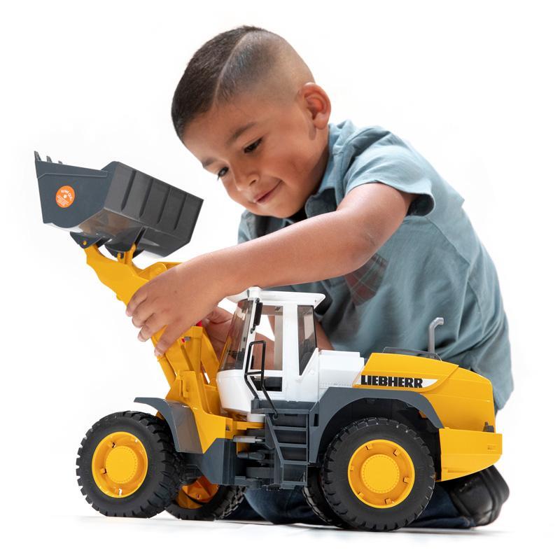 Steer clear of Bruder’s Liebherr Articulated Road Loader L 574! This tough construction vehicle has articulated steering, allowing it to make sharp turns and fit into small areas. The front loader can be raised or lowered by a lever, or locked into place when not in use. Other features include suspension for the rear wheels, a hood that opens to reveal the engine, and tread tires.