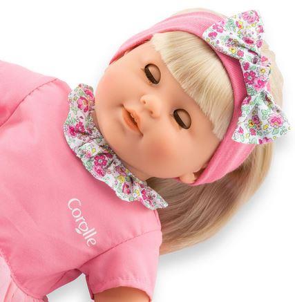 The doll's face, arms and legs are made of delicately vanilla-scented, soft-touch vinyl. Its soft body means it can move easily and even sit up “all on its own”. It can keep its thumb in its mouth. With its sleeping eyes, it falls asleep when put down on its back. Adèle is wearing a dress with a headband and ballet flats.