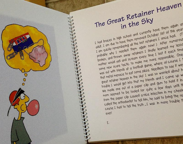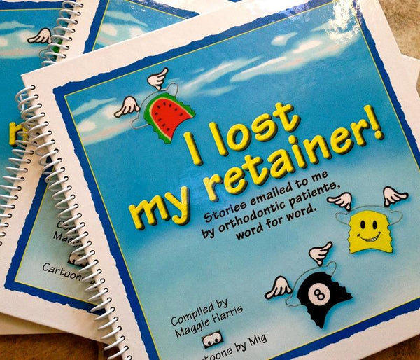 It seems everyone has either lost their retainer or knows someone who has. This book is a compilation of funny stories emailed to me by orthodontic patients. And illustrated with cartoons. Specifications: laminated front & back cover, 9″ x 9″ size, spiral bound, with 54 pages of text and cartoons.