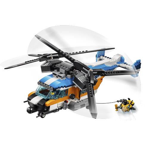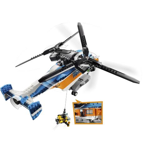 Enjoy 3 building opportunities with this LEGO® Creator 3in1 set. Build the Twin Rotor Helicopter and then rebuild it into a Jet or Hovercraft toy for more fast-moving adventures. The Twin Rotor Helicopter features large synchronized rotors, tinted cockpit with 2 seats, opening side and rear cargo bay doors and a working winch, plus an ROV submarine that fits into the cargo bay. Turn the gear wheel to spin the helicopter's huge synchronized rotors. Open the helicopter's rear cargo bay door and load up the included ROV submarine. Slide open the helicopter’s side door and turn the gear wheel to operate the working winch. Check out the helicopter’s cool orange, blue, white, black and gray color scheme. Includes a pilot minifigure, ready for adventure. Twin Rotor Helicopter toy measures over 6" high, 14" long and 12" wide. Jet toy measures over 3" high, 10" long and 10" wide. Hovercraft toy measures over 3" high, 7" long and 3" wide.