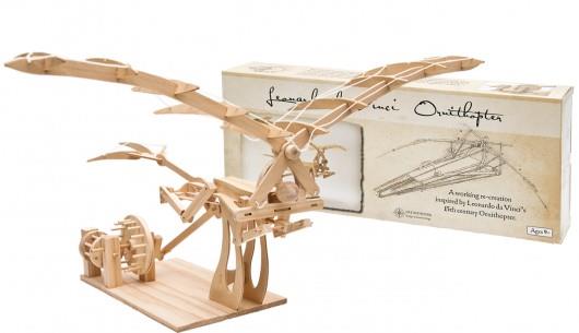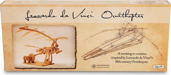 Voler a toujours été un rêve pour les humains, et la fascination de Leonardo pour les oiseaux et la fuite était évidente dans ses études sur les oiseaux et les différentes machines volantes actionnées par l'homme. Son design ornithophobe a capturé l'imagination des gens depuis des générations, et nous avons combiné sa machine volante cool avec un de ses modèles d'engrenages coniques pour faire un modèle de travail propre avec des ailes battant et un pilote avec les bras et les jambes en mouvement. Bien qu'il reste un mystère si son dessin d'ornithoptère a été jamais entièrement fait ou testé à l'époque, il ya beaucoup d'idées (suspendues dans des musées à travers le monde!) de ce qu'il aurait pu ressembler, et nous avons ajouté nos idées aussi.
