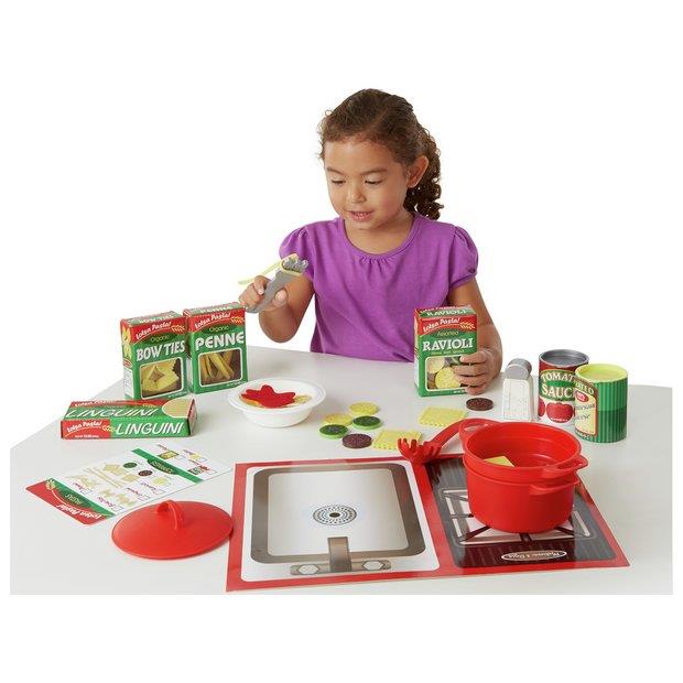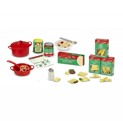 Prepare perfect pretend pasta every time with this 50-plus-piece pasta-making set! Fun pasta boxes hold felt penne, bow tie pasta, linguini, and ravioli pockets that can be hand-stuffed with felt spinach, meat, or cheese fillings. Follow the illustrated guide to order and "cook" the pasta in the large cook pot with lid, and "strain" it in the colander (the box doubles as a cook top and a sink!). Use the pasta spoon to scoop into the included pasta bowl, top with tomato sauce, cheese, or, butter toppings, and dig in! The set also includes a sauce jar, cheese shaker, salt shaker, and fork. This inventive set lets kids create countless imaginative pasta meals from start to finish!