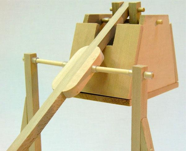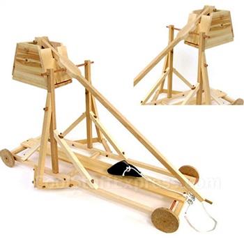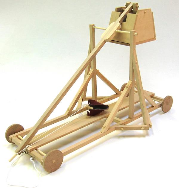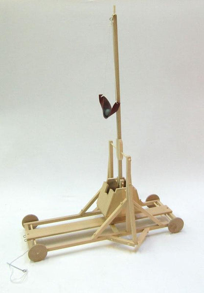 Considered by many to be the most powerful and destructive of all the siege engines, the trebuchet took many forms throughout the Medieval world, hurling huge rocks, giant fireballs and even diseased animals at (and into) castles. This model, based on the Warwolf, is a tabletop working replica of a trebuchet made in the 13th Century. Standing 24 inches (60 cm) tall by 11 inches (27 cm wide) this model will shoot balls of plasticine (included) over 20 feet! Please be careful of what (or whom) you take aim on, this thing can really let loose. An easy to make and use kit, with the pieces pegged for extra strength, this is a great kit for family learning about counterweights and projectiles, and is a great resource for STEM activites!