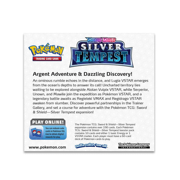 An ominous rumble echoes in the distance, and Lugia VSTAR emerges from the ocean’s depths to answer its call! Uncharted territory lies waiting to be explored alongside Alolan Vulpix VSTAR, while Serperior, Unown, and Mawile join the expedition as Pokémon VSTAR, and a legendary battle awaits as Regieleki VMAX and Regidrago VSTAR awaken from slumber. Discover powerful partnerships in the Trainer Gallery, and set a course for adventure with the Pokémon TCG: Sword & Shield—Silver Tempest expansion! Each booster pack contains 10 cards and either 1 basic Energy or 1 VSTAR marker. Cards vary by pack.