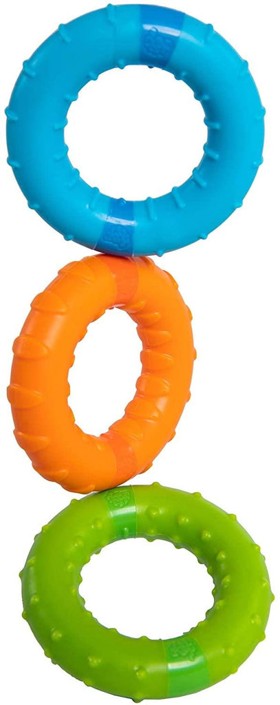 Rings each feature rubbery surface, unique textures, built-in rattle